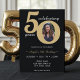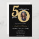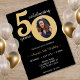 Partiinbjudan till Black och guld grattis på födelsedagen för 50-åring. Unisex-design för kvinnor eller för manar. Anpassa åldern till kostym i tillfälle och lägg till ett personligt foto till mottagaren. Underbar för 50-årsjubileum eller födelsedagsfest för 50-årsbash.