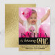 Svart och guld födelsedagsinbjudan för första födelsedagen med svarta och gyllene folierade ränder och text på en bakgrund med fullständigt foto och guld folie bak. Du kan enkelt anpassa denna eleganta svarta och gyllene inbjudan till första födelsedagen genom att helt enkelt lägga till ditt foto och evenemangsinformation. Du kan ändra typsnittsstil och färg och flytta texten efter behov för ditt foto. Detta är en tryckt design utan riktig folie. Du kan ta bort den gyllene bakgrunden för att lägga till en färg i bakgrunden.