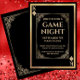 Den här inbjudan till Game Nght-festen innehåller en klassisk spelkortsdesign på en svart bakgrund. En ornat, vintage stil ram, omger mitttextområdet. En matchande guld-folie utformar ram gräns inbjudan. Två guld-diamanter och Kung-monogrammet trycks i motstående hörn, liknande layouten i kortdäcket.