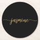 Flickig svart och guldmonogramnamn Namnteckning Script Anpassad personlig rund papper coaster. Dessa mönster har ditt förnamn i en vacker handskriven svansfont tecken typografi på svart och guld. Dessa är enkla att anpassa. Snygg feminin husuppvärmningspresent, även för födelsedag, bröllop, brud shower, söt 16 födelsedagsfest, mors dag, baby shower, för examen fest och Det är för tjejen som älskar unika minimala snygga saker.