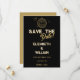 Denna svarta och guld-retro-disco-groovy bröllop spara datum kan vara personlig med era uppgifter i modern typografi. Designad av Thisisnotme©
