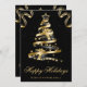 Elegant svart och guldgnistrande band julgran design på en svart bokeh bakgrund med snöflingor och band hörn och ett personligt foto som kan anpassas.