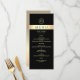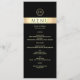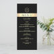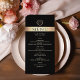 Tillsätt en sofistikerad touch till ert bröllopsbord med denna lyxiga svarta och gyllene meny med ett modernt monogram högst upp och elegant typografi genomgående. Den formella svarta bakgrunden, i kombination med ett skinande falskt guld band, skapar en chic och tidlös look — perfekt för exklusiva, glamourösa eller formella bröllopsreceptioner. Helt anpassningsbar för att återspegla ert bröllopsdatum, initialer och unika middagsval.