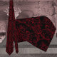 En svart och röd halslips i bröllop med en röd blommigt mot en fast svart bakgrund.