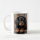 Bilden skildrar Cavalier Kung Charles Spaniel-valpen med svart och brunt päls. Kavie är sitta i rad, tittar direkt vid visningsprogrammet. Valpen har stort, uttryckligt ögon och flytande öron. Bakgrunden är mjuk, suddig brun, skapar varm och inbjudande atmosfär. Målningen stil är realistisk och innehåller uppgifter om valparnas päls och egenskaper.