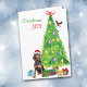 På julkortets framsida bär en svart och Tan Coonhound en julhatt medan han sitter bredvid en Helgdag. Paket som har en lätt inslagen gåva är utspridd och en tjurfäktning landar på Julgran. I den röda och grönt texten står det "Jul JOY". Insidan är stiliserad text som säger GOD JUL och en fält som du kan anpassa.
