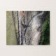 Det här pusslet är ett foto av ett svart och brunt koonhound som går på ett fallande träd i floden.