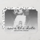 Modern sparar datumkortet i ett minimalistiskt format. Lägg bara till ett foto av dig och din partner. Spara datumet skrivs i ett underbart skript som ett fotoöverlägg. Baksidan har en svart och vit chic mönster av sprinkler.