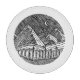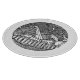 Abstrakt svart och vit bläcktecknad rund alplandskap på natten, med en stjärnhimmel och måne, och en skogslandskap i förgrunden.