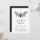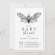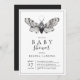 Minimalistisk svart-vit fjäril baby shower-inbjudan. Böcker till bebis önskas på baksidan.