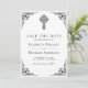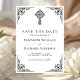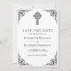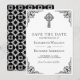 Överraska dina gäster med detta vintage-inspirerade kristna bröllop sparadatum med en elegant svart utsmyckad ram och keltiskt kors på en vit bakgrund.