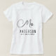 Designen visar en elegant minimalistisk t-shirt för kvinnor i svart och vitt. En vacker unik "mrs"-text i fantasifull kalligrafi högst upp och ett anpassningsbart efternamn och datum längst ned. Designen är extremt unik och klassisk och kommer att vara en elegant present till bruden eller nygifta