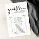 Späd möhippan med den här chicen, minimalistisk gissning Vem spelar! Ta med en modern vrid till det klassiska spelet med den här helt enkelt svarta och vita eleganten. Denna moderna Gissa vem som spelar är perfekten för att få den blivande bruden och hennes gäster att röra sig och skratta. Med sitt rena, minimalistiska stil lägger det en snyggt vid vilken möhippa som helst firande. Anpassa spelkorten med roligt frågor om paret för att starta samtal och skratt.
