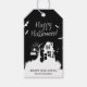En anpassningsbar Halloween-fest presentetikett med ett spökhus med katter, fladdermöss, gravsten och ugglor och svart-vit-randiga bakgrund. Denna presentetikett är perfekt för festfavoriter.