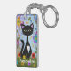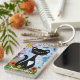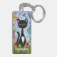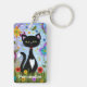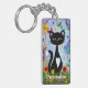 En svart och vit tuxedo-katt med söt grönt ögon, rosa öron och med röd hals. Hon är sitta i en trädgård av grönt gräs och söt färgstarka blommor på en ljusare sommardag. Runt henne flyter hon löv och flödar fjärilar. I grund i nyckelkedjan i vit text finns en mall där du kan lägga till ditt namn eller annan text.