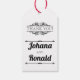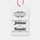 Svartvit fet typografi och vintage inslag bröllop Tack-märkre. Den här märkrn av presenter i elegant har namnen i fet svart typografi, texten "Tack" och vintage inslag som utgör ramar.