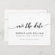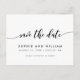 Snygg "Spara datumet" vykort med orden "Spara datumet" i ett avspänt kursiv stil i svart mot en vit bakgrund.