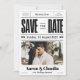 Det här unika svartvitt som sparar datumet har en lekfull tidningslayout, perfekt för en roligt och ett modernt bröllop. Det är mer än bara ett spardatum, det är ett snabbt meddelande om din kärlek-historia!