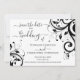 Festiva och fantasifulla inbjudningar till svartvitt snurrar bröllop spara datum. Dekorativa snurrar med löv och ro och vackert typsnitt med snurrande ligaturer. Enkla, moderna och klassiska rena bröllop spara datum-kort, med anpassningsbarnas foto på baksidan av kortet.