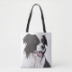 Den här användbara, för väskan ovanliga designen har mitt teckning i en svart och vit Gräns-kollie med blått öga. Teckning är baserat på min egen sällskapsgris zigenare, som var lojal vän i många år. Hon blått öga, men jag har också sett kollier med brunt öga, och till och med en av dem!