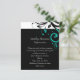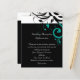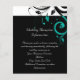 Dold och slående modern contemporary, svarta bröllopsinbjudningar med vita och akvatiska tealturkoaccenter, med festive swirl rulla löv bakgrund. Anpassa onlinen med bröllop-informationen.