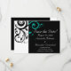 Moderna samtida svarta bröllopsinbjudningar med vita och akvafärgade turkosa accenter, med festlig virvelrulle bladbakgrund. Anpassa online med dina bröllopsdetaljer.