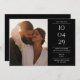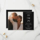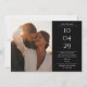 Ett modernt, minimalistiskt spara-date-kort med speciella datum-, foto- och bröllop-detaljer som finns i klassisk, chic-typografi på svart bakgrund. Designad av Thisisnotme©