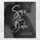 Dessa moderna, eleganta etiketter för vinflaskor för bröllop spara datum har ditt eget personliga foto som täcker bakgrunden helt. Ett genomskinligt svart överlägg innehåller vit trendig skript typografi. En glamourös, stilren look som dina gäster kommer att älska!