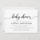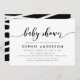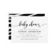 Snyggt Baby Shower-inbjudan med ord "Baby Shower" i ett slappna av, kursivt skript i svart mot en vit bakgrund. Kortet har en svart baksida med överlappande vitt linjer. Anpassa den genom att ersätta platshållartexten. Om du vill ha fler alternativ som att ändra teckensnittet och det är storlekt/färg eller mellanrummet mellan brev klickar du på knappen "Anpassa". *Observera att Zazzle Watermark som visas i zoomförhandsvisningen INTE visas på den färdiga tryckta produkten. © Rosewood and Citrus