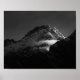 Ett svart och vitt landskapsfoto av stora vind som blåser snö av berget.
