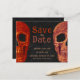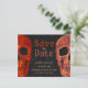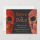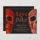 Roligt, gotiskt skallhuvud Spara orangen Datum, svart vintage stil budget Halloween-bröllopsinbjudan. Spooky, coola Hallobröllop firande. Till Döden gör oss del-skript. Upphovsrätt Marg Seregelyi Fotography.