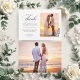 Färdigställ din Black Palm Tropical-bröllopssats med detta eleganta tackkort. Med en minimalistisk men ändå sofistikerad design visar den ditt valda bröllopsfoto i en cirkulär ram tillsammans med ditt personliga tackmeddelande, namn och bröllopsdatum. Baksidan tillför en hjärtlig touch med ytterligare ett älskat foto, frasen "Bästa dagen någonsin" och ert efternamn efter giftermålet - vilket skapar en tidlös souvenir som era gäster kan minnas. Perfekt för att uttrycka er tacksamhet med stil och grace!