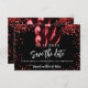 Ett giftigt och trendig Spara datum för en 18:e (eller någon annan ålder) födelsedagsfest. En svart bakgrund dekorerad med röda konfetti och ballonger. Anpassa och lägg till datum och namn/ålder. Texten: Spara datumet skrivs med ett stort trendig-handskript i stil.
