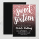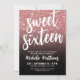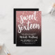 Söt sexton-års födelsedagsfestinbjudan. Fira sexton med stil med denna moderna och festliga design. Framsidan har en falsk rosa guld glitterbakgrund som bleknar till en snygg svart gradient längst ner, med orden ”Söt sexton” vackert markerade längst upp i elegant skrivstil. En blandning av skrivstil och rena moderna typsnitt i krispigt vitt skapar en slående kontrast som känns både chic och tidlös. Baksidan har en solid svart bakgrund för en enkel, polerad finish. Perfekt för att fira 16 år, kan denna inbjudan anpassas med ditt val av typsnitt och bakgrundsfärger för att passa vilket festtema som helst.