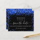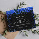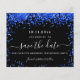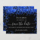 En svart bakgrund dekorerad med royal blue konetti. Anpassa och lägg till datum och namn/ålder. Texten: Spara datumet skrivs med ett stort trendig-handskript i stil.