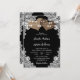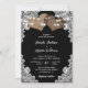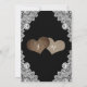 Svartvit inbjudan till landsbyggsbröllop med två brännhjärtshjärtan, sträng ljus och vit blommigt snöre. Utformning av perfekt för din svarta, roliga bröllopsfest.