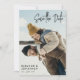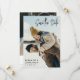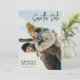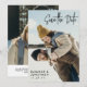 Dubbel sidig spara datum-kort med en modern signatur skrift i svart. Lägg till era namn och bröllopsdatum i rena moderna bokstäver. På baksidan, lägg till fler detaljer och ett annat foto.