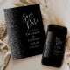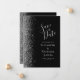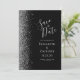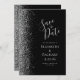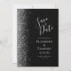 Det moderna bröllop spara datum-kortet från elegantens lämnat kant har ett silver faux glitter gräns. Med anpassadet kombineras handskrift, tryckplåt och kursivt typsnitt med silver grått mot svart bakgrund. Den omvända sidan har en matchande design för svart och silver.