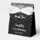 En elegant och glamorös födelsedag, vilken ålder som helst. En svart bakgrund med faux silver glitter, gnistor. Med texten: Tack! Anpassa och lägg till din namnålder och ett datum. Vit brev. Namn är skrivet med ett handskript i trendiget stil.