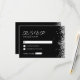 Modern Svart Silver Bröllops-RSVP-kort - har glittrande droppar på den svarta bakgrunden med vit text.