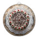 Svart skogskaka på rustiskt trä piltavla