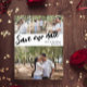Bröllop spara datum vykort som du kan anpassa med fyra av dina egna bilder, tre mindre och en större. Spara vårt datum skrivs diagonalt över vykortet i en svart skrift. Lägg till dina namn och bröllopsdatum i en ren font.