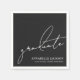 Denna enkla och moderna examensfestliga pappersservett har en ren svart bakgrund med vita typsnitt för en tidlös, könsneutral look som fungerar vackert för både pojkar och flickor. All text är snyggt placerad i det nedre högra hörnet för en elegant, återhållsam stil. ”Examen” visas i elegant handskriven stil, tillsammans med examenstagets namn, ”Klass av 2026” (eller vilket år som helst) och skolans namn i klassiska serif-typsnitt.