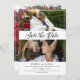 Spara datumkortet på dubblan med två foton i en ren kollage på ena sidan och ett större foto på den andra. Spara datumet skrivs i ett romantiskt svart skript. Lägg till namn- och bröllop-informationen i en minimalistisk och elegant typografisk design. På baksidan kan du också lägga till webbplatsen bröllop.