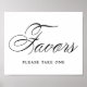 Det här vackra och tidlösa vågrät "Favors: Ta ett"-skylten i bord tillför en enkel elegans till alla klassiska bröllopsmottagningar, duschar eller party-motiv. Den lyxiga skriptdesignen har en nyktert och romantisk modern svart kalligrafiskrift. Det vackra teckensnittet med anpassadets bakgrund färg gör det enkelt att passa alla teman. För andra färg eller matchande produkter, gå till butiken JustFharryn Zazzle eller kontakta designern, c/o Fharryn@yahoo.com Alla höger reserverade. #zazzlemade