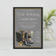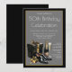 Fira med stil med vår formella födelsedagsinbjudan för män! Med eleganta svarta och gyllene presenter, champagne och smoking på en sofistikerad grå, svart och gyllene bakgrund. Anpassa med din ålder och evenemangsinformation. Perfekt för en oförytterlig och exklusiv fest.