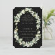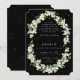 En svart mottagningskort för vinterbröllop, med handmålade snöbär och stjälkar av eukalyptus arrangerade i en vacker botanisk ram. All text är helt redigerbar, och de spridda prickarna på framsidan och baksidan kan raderas innan beställning om så önskas. Se denna kollektion i min butik för inbjudningar med alternativa formuleringar, olika färger och för koordinerade artiklar.