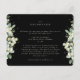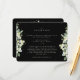 Ett svart platt vigselkort för bröllopsmottagningar som hålls på en annan plats än vigselceremonin. Kortet har en kant av handmålade snöbär och eukalyptus på framsidan och en krans på baksidan. All text är helt redigerbar och de spridda prickarna på fram- och baksidan kan raderas innan beställning om du föredrar det. Detta kort finns tillgängligt med alternativa botaniska mönster, i stående format och i olika färger. Vänligen se kollektionen i min butik för att se alla alternativ och matchande artiklar.