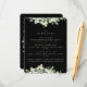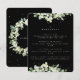 En svart svarskort för bröllopsrepetition, för användning när repetitionsceremonin och middagen hålls på två olika platser. Med en kant av handmålade snöbär och eukalyptus. All text är helt redigerbar, och de spridda prickarna på fram- och baksidan kan raderas innan beställning om du önskar. Vänligen se denna kollektion i min butik för alternativa formuleringar, blommarrangemang, olika färger och för koordinerade artiklar.