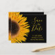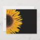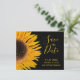 Budgeterad solrosa i gulten land på svarta bakgrundskort i land Spara datum meddelande. Snygg, enkel blomsterdesign. Upphovsrätt Marg Seregelyi Fotography.